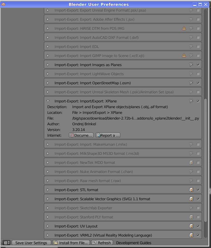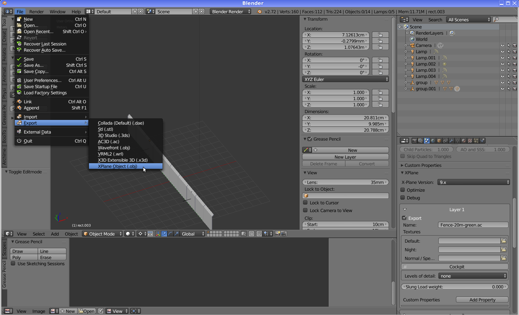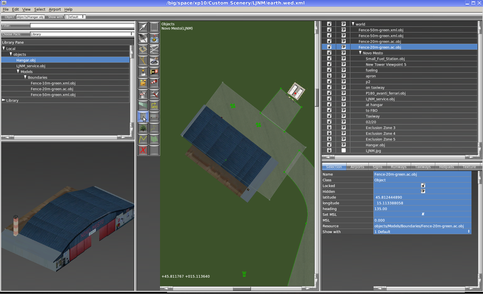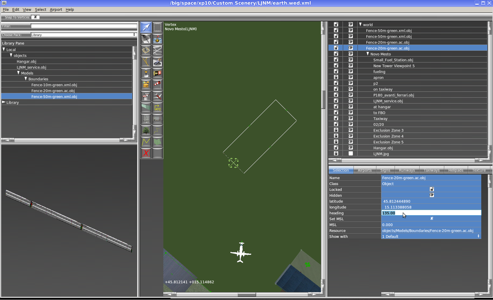 .stg lines: https://github.com/mherweg/d-laser-fgtools/blob/master/wed2stg.py if you feel like improving WED, here is the code: http://developer.x-plane.com/code/#Get_the_source_code http://dev.x-plane.com/cgit/cgit.cgi/xptools.git/tree/src In case you use blender and the 2 addons io_scene_ac3d and io_xplane2blender to convert from .ac to .obj: After import you have to go to properties->scene and add one x-plane layer. enable Export for Layer 1 and name it like the object without extension. e.g. Fence-50m-green.ac -> Fence-50m-green ..or maybe with the extension - I'll have to try that: Fence-50m-green.ac -> Fence-50m-green.ac Fence-50m-green.xml -> Fence-50m-green.xml it would be nice to have a command line tool for this conversion step, similar to: xplane2fg http://wiki.flightgear.org/index.php?title=Howto%3AConvert_objects_from_X-Plane&type=revision&diff=81008&oldid=69852#Convert If you edit the heading in WED then use the "north" hand of the cross to get headings from 0 to 359 degrees. avoid negative headings! you can also enter exact headings in the property menu on the bottom right in WED. use "Edit->Duplicate" crl-sh-D to create many objects with the same heading. |