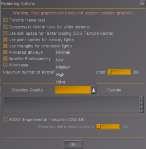 If your render quality or framerate is too low, click "View > Rendering Options" to adjust the graphic settings. For newer hardware, it's recommended to set "graphics quality" to high and check "use disk space for faster loading", "animated jetways" and "satellite photoscenery".
